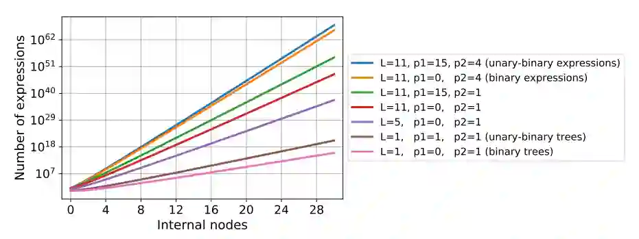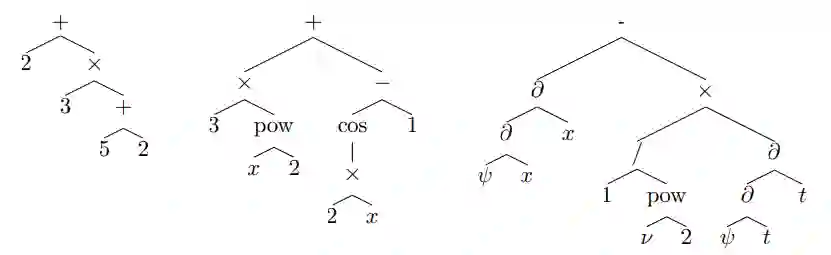 使用该方法的必要条件是生成解析解为 c 的函数 f(x, c)。由于这里使用的所有运算符和函数都是可逆的,因此确保 c 为解的简单条件是确保 c 在 f(x, c) 树表示的叶节点中仅出现一次。生成恰当 f(x, c) 的直接方式是使用附录中 C 部分介绍的方法采样随机函数 f(x),并将其树表示中的一个叶节点替换成 c。以下示例展示了全过程: