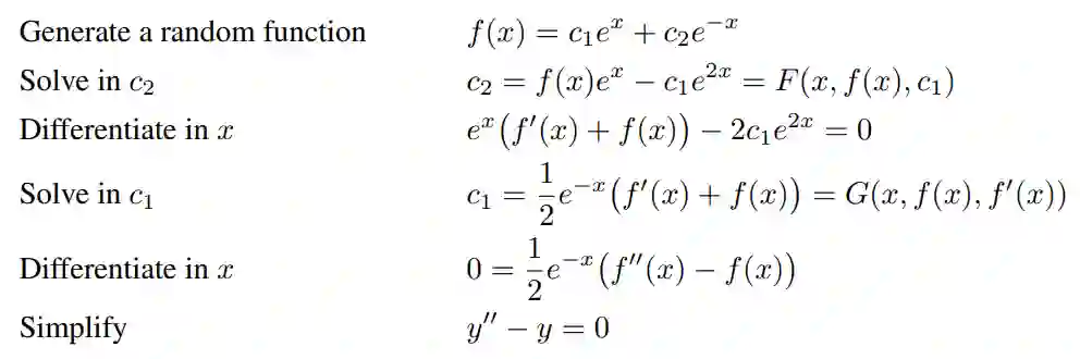 研究者没有生成随机函数 F,而是生成解 f(x, c),并确定它满足的微分方程。如果 f(x, c) 的解析解是 c,则我们计算 F 使 F (x, f(x, c)) = c。通过上述方法,研究者证明,对于任意常量 c,x |→ f(x, c) 都是微分方程 3 的解。最后,对得到的微分方程执行因式分解,并移除方程中的所有正因子。