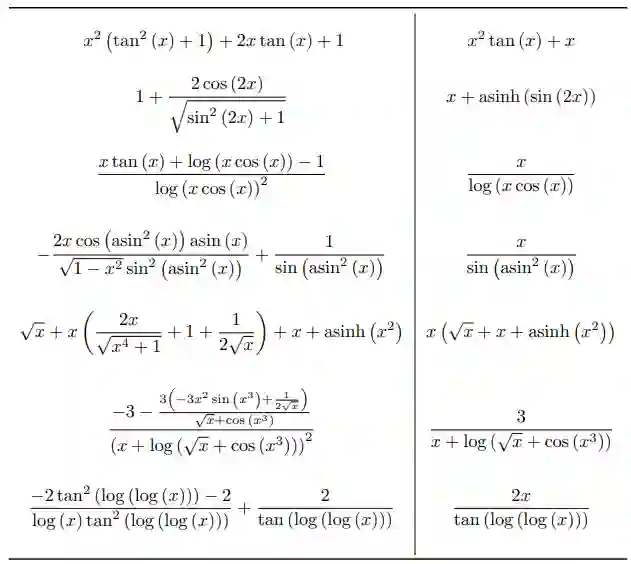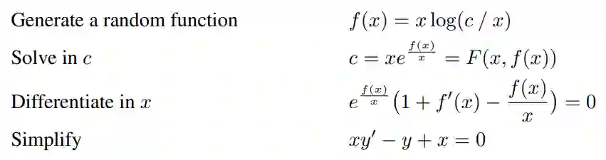 利用该方法,研究者通过附录中 C 部分介绍的方法生成任意函数 F(x, y),该函数的解析解为 y,并创建了包含微分方程及其解的数据集。