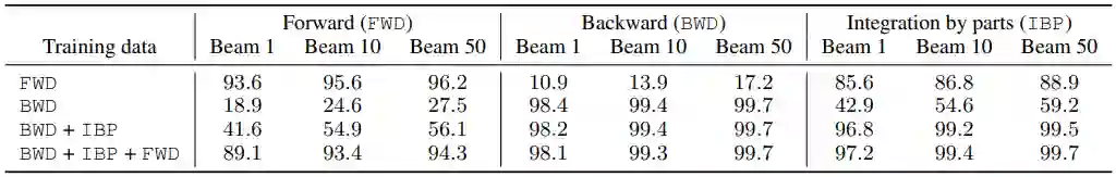 使用部分积分的后向生成(Backward generation with integration by parts (IBP)):该方法利用部分积分:给出两个随机生成函数 F 和 G,计算各自的导数 f 和 g。如果 fG 已经属于训练集,我们就可以知道其积分,然后计算 Fg 的积分:
