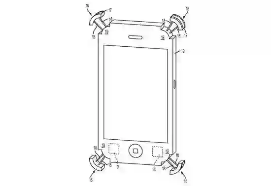 今年 4 月曝光的一份专利显示,苹果设计了一种特殊的手机外壳,与汽车的安全气囊相似,苹果在手机的四个角上分别设有 1 个弹出式的减震器装置。当 iPhone 内置的传感器检测到设备正急速坠落时,4 个角的减震器装置将自动弹出以避免 iPhone 直接与地面碰撞。