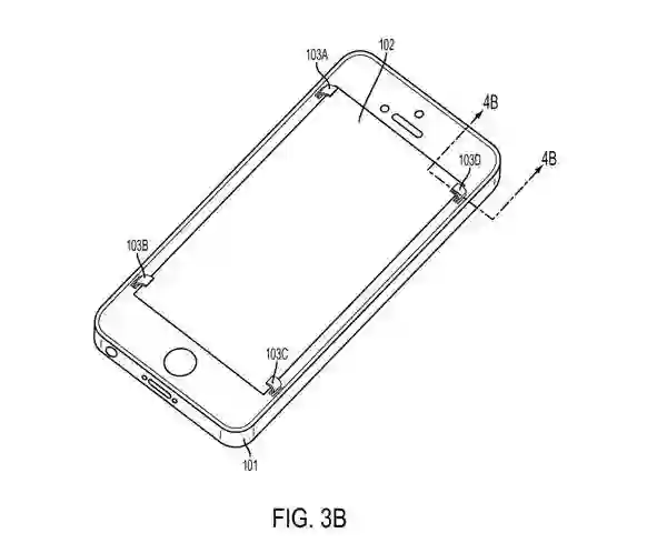 类似的,苹果还申请了在屏幕四周设计可伸出式的金属减震器的专利,在手机跌落时,系统会自动识别并将其伸出,防止屏幕摔碎。