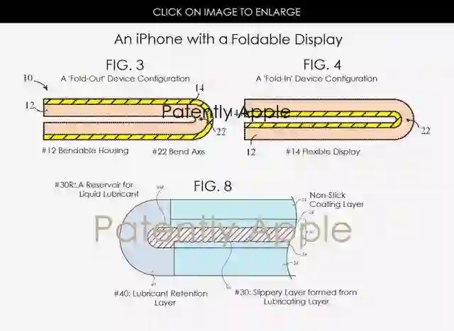 而实际上,苹果更早的时候其实已经有了很多关于柔性屏的专利布局。比如今年 3 月美国专利和商标局(USPTO)公布一项苹果申请的专利,专利中提到可折叠 iPhone 的外壳内将使用一种高级润滑系统,以防止显示器的相邻薄层彼此粘附,避免显示层内的过大应力堆屏幕造成的不良影响。