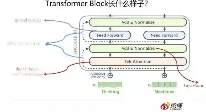 它的照片见上图,看上去是不是很可爱,有点像安卓机器人是吧?这里需要强调一下,尽管 Transformer 原始论文一直重点在说 Self Attention,但是目前来看,能让 Transformer 效果好的,不仅仅是 Self attention,这个 Block 里所有元素,包括 Multi-head self attention,Skip connection,LayerNorm,FF 一起在发挥作用。为什么这么说?你看到后面会体会到这一点。