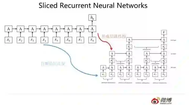 第二种改进典型的思路是:为了能够在不同时间步输入之间进行并行计算,那么只有一种做法,那就是打断隐层之间的连接,但是又不能全打断,因为这样基本就无法捕获组合特征了,所以唯一能选的策略就是部分打断,比如每隔 2 个时间步打断一次,但是距离稍微远点的特征如何捕获呢?只能加深层深,通过层深来建立远距离特征之间的联系。代表性模型比如上图展示的 Sliced RNN。我当初看到这个模型的时候,心里忍不住发出杠铃般的笑声,情不自禁地走上前跟他打了个招呼:你好呀,CNN 模型,想不到你这个糙汉子有一天也会穿上粉色裙装,装扮成 RNN 的样子出现在我面前啊,哈哈。了解 CNN 模型的同学看到我上面这句话估计会莞尔会心一笑:这不就是简化版本的 CNN 吗?不了解 CNN 的同学建议看完后面 CNN 部分再回头来看看是不是这个意思。
