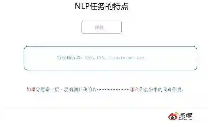 NLP 任务的特点和图像有极大的不同,上图展示了一个例子,NLP 的输入往往是一句话或者一篇文章,所以它有几个特点:首先,输入是个一维线性序列,这个好理解;其次,输入是不定长的,有的长有的短,而这点其实对于模型处理起来也会增加一些小麻烦;再次,单词或者子句的相对位置关系很重要,两个单词位置互换可能导致完全不同的意思。如果你听到我对你说:「你欠我那一千万不用还了」和「我欠你那一千万不用还了」,你听到后分别是什么心情?两者区别了解一下;另外,句子中的长距离特征对于理解语义也非常关键,例子参考上图标红的单词,特征抽取器能否具备长距离特征捕获能力这一点对于解决 NLP 任务来说也是很关键的。