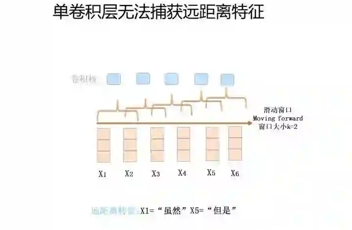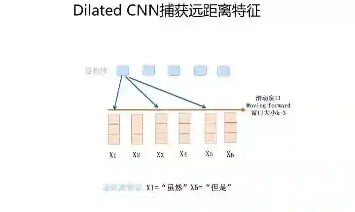 那么怎样才能捕获到长距离的特征呢?有两种典型的改进方法:一种是假设我们仍然用单个卷积层,滑动窗口大小 k 假设为 3,就是只接收三个输入单词,但是我们想捕获距离为 5 的特征,怎么做才行?显然,如果卷积核窗口仍然覆盖连续区域,这肯定是完不成任务的。提示一下:你玩过跳一跳是吧?能采取类似策略吗?对,你可以跳着覆盖呀,是吧?这就是 Dilated 卷积的基本思想,确实也是一种解决方法。