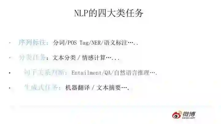 通常而言,绝大部分 NLP 问题可以归入上图所示的四类任务中:一类是序列标注,这是最典型的 NLP 任务,比如中文分词,词性标注,命名实体识别,语义角色标注等都可以归入这一类问题,它的特点是句子中每个单词要求模型根据上下文都要给出一个分类类别。第二类是分类任务,比如我们常见的文本分类,情感计算等都可以归入这一类。它的特点是不管文章有多长,总体给出一个分类类别即可。第三类任务是句子关系判断,比如 Entailment,QA,语义改写,自然语言推理等任务都是这个模式,它的特点是给定两个句子,模型判断出两个句子是否具备某种语义关系;第四类是生成式任务,比如机器翻译,文本摘要,写诗造句,看图说话等都属于这一类。它的特点是输入文本内容后,需要自主生成另外一段文字。
