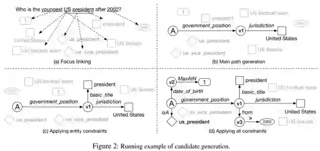 1. Focuslinking(焦点链接)包含实体链接(S-MART工具实现),类型链接(抽取文本的1,2,3元文法,通过词嵌入相似性得到排名top 10的类型结果),时间链接(使用日期格式匹配得到),排序链接(构建最高级词表/序数+最高级模板)等四种;