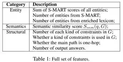 为了从候选查询图中识别出最优的结果,需要计算问题和每个查询图之间的全局联合得分(overall association score),这个得分由实体链接/语义匹配/结构等级等特征得分加权得到,具体特征如下表所示: