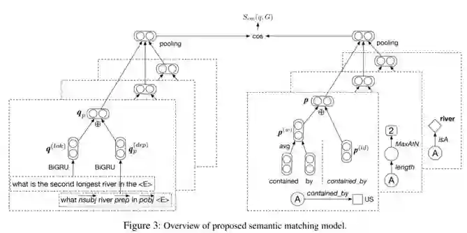 1. 首先,原始问题中的实体/时间均被替换为标识符<E>/<Tm>,并且得到其依存解析结果序列,分别使用BiGRU编码并相加融合得到其表示;