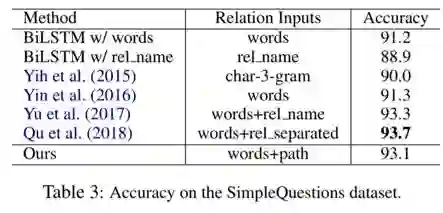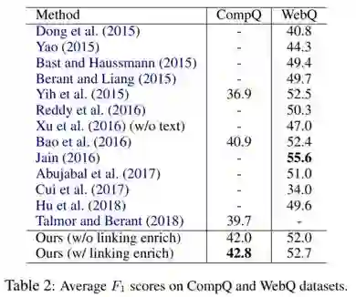 对于作者提出的End2End模型,在CompQ与WebQ数据集上的结果如下,评价指标为答案的平均F1值。可以看到,对于复杂问题的解答性能上,该模型相对其他方法有显著提升,在简单问答任务上,也展现出较为优秀的性能。