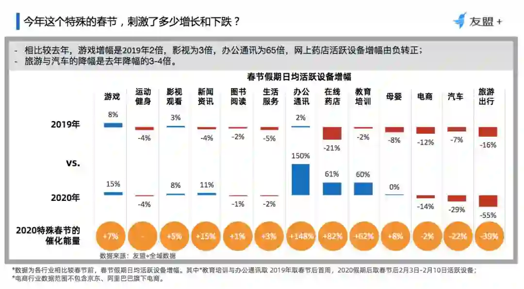 据友盟+最新发布的《移动互联网“战疫”报告》显示:今年春节前后对比2019年同期,游戏行业增幅15%,增幅是去年同期的2倍;影视增幅8%,增幅是去年同期的3倍;办公通讯上涨明显,增幅150%,网上药店活跃设备增幅由负转正,增幅61%;旅游与汽车跌幅分别为55%及29%。