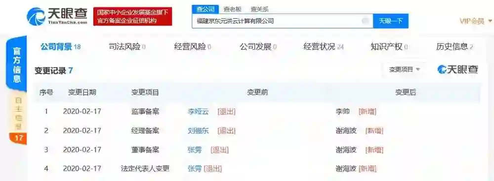 36氪获悉,天眼查数据显示,2月17日,京东云计算全资子公司福建京东元洪云计算有限公司发生工商变更,刘强东卸任该公司经理一职,由谢海波接任。同时,刘强东助理张雱卸任该公司执行董事和法定代表人,仍由谢海波接任。天眼查股权结构显示,该公司为京东云计算有限公司全资子公司,刘强东为后者大股东,持股45%。