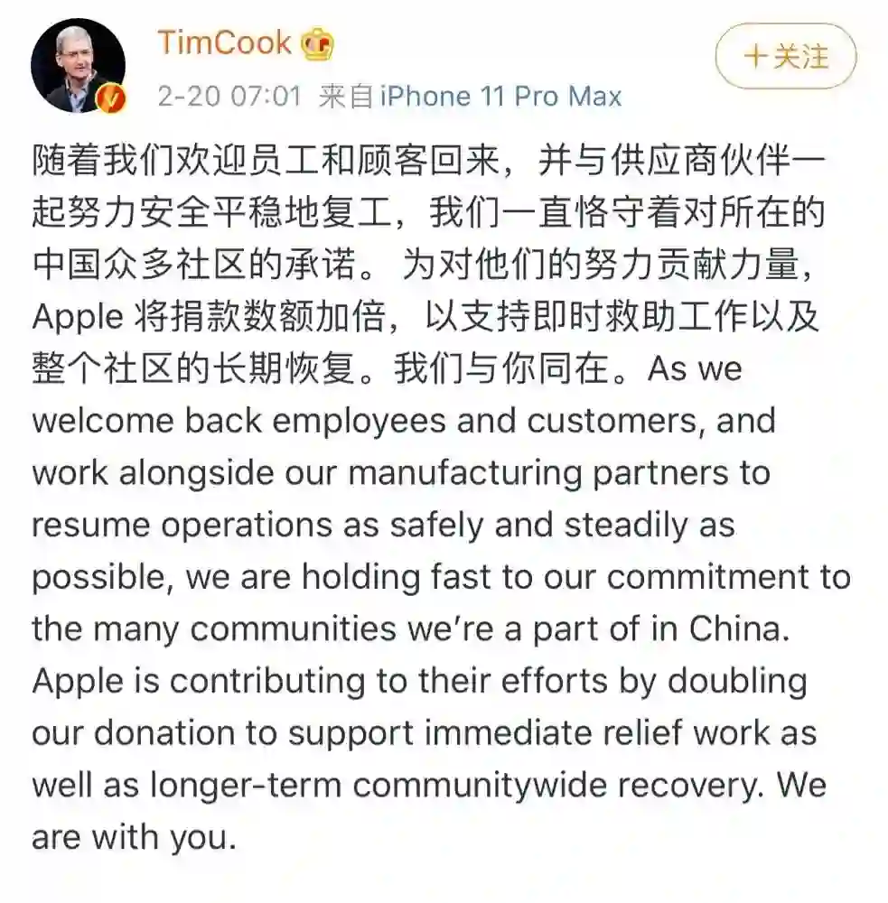 36氪获悉,苹果CEO库克发布微博称,“随着我们欢迎员工和顾客回来,并与供应商伙伴一起努力安全平稳地复工,我们一直恪守着对所在的中国众多社区的承诺。 为对他们的努力贡献力量,Apple将捐款数额加倍,以支持即时救助工作以及整个社区的长期恢复。我们与你同在。”