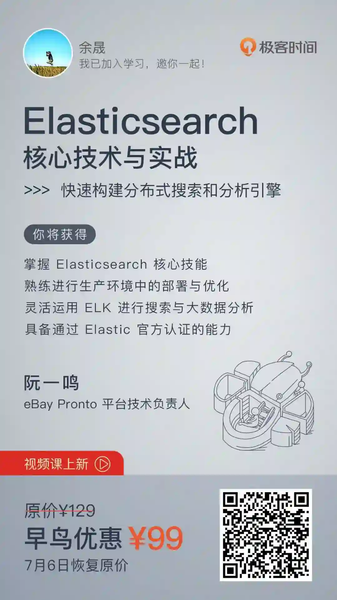 最近,他跟极客时间合作,推出了一门视频课《Elasticsearch 核心技术与实战》。