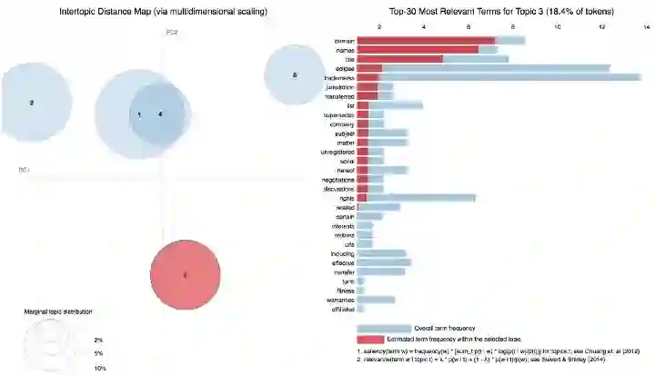 PyldaVis库被用来对主题模型进行可视化。 请注意,Topic 1和Topic 4之间有非常紧密的联系,Topic 2,3和5主题是相互区分开的。 这些主题(2,3和5)在法律文件中包含了相对独特的主题,并且应该进行更细致的观察,因为它们在合并时提供了更宽的文档视图: