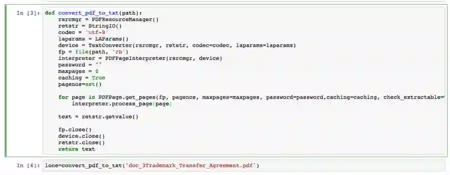 双方之间的法律协议是作为pdf文件提供的(也就是我们必须首先从PDF文档中提取文本)。 首先使用下面的函数提取pdf文档中的文本。 这个函数使用python库pdf-miner,从PDF文档中提取除了图像以外(当然也可以修改这个函数,使之能处理图像)的所有字符。 该函数简单地取得主目录中pdf文档的名称,从中提取所有字符,并将提取的文本作为python字符串列表输出。