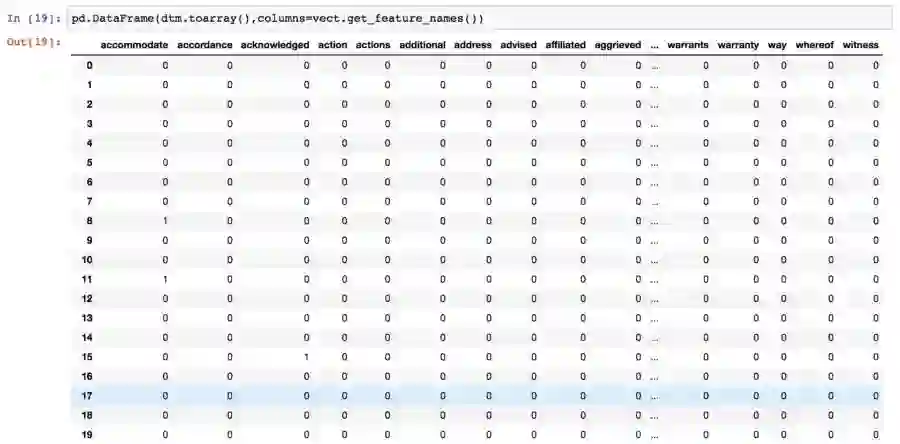 使用scikit-learn中的CountVectorizer只需要调整最少的参数,就能将已经清理好的文档表示为DocumentTermMatrix(文档术语矩阵)。 CountVectorizer显示停用词被删除后单词出现在列表中的次数。