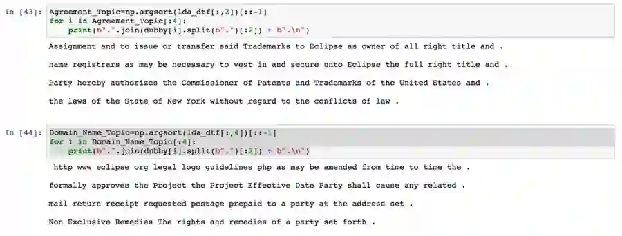 从上面的结果可以看出,Topic-2与商标所有权协议的条款和条件有很大关系。 Topic -1讨论了签字方和当事方之间的协议。 ECLIPSE这个词似乎在所有五个主题中都很流行,这说明它在整个文档中是相关的。