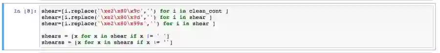 从pdf文档中提取的文本包含无用的字符,需要将其删除。 这些字符会降低我们的模型的有效性,因为模型会将无用的字符也进行计数。下面的函数使用一系列的正则表达式和替换函数以及列表解析,将这些无用个字符替换成空格。我们通过下面的函数进行处理,结果文档只包含字母和数字字符。