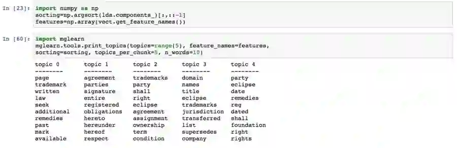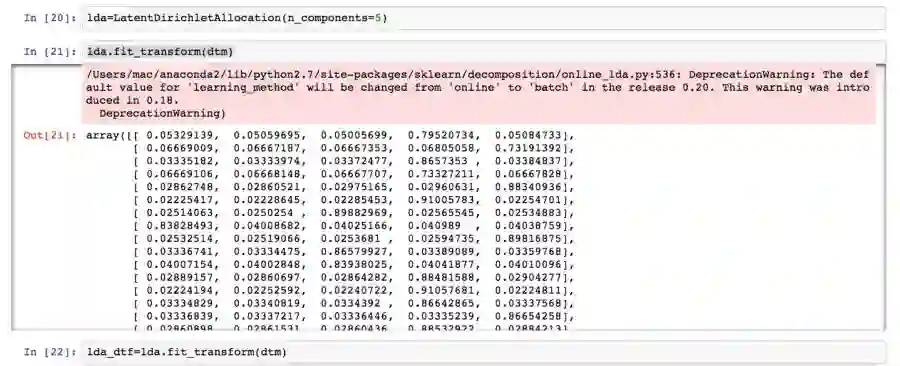 该文档术语矩阵被用作LDA(潜在狄利克雷分布Latent Dirichlet Allocation)算法的输入。 现在有一些LDA算法的不同实现,但是对于本项目,我将使用scikit-learn实现。 另一个非常有名的LDA实现是Radim Rehurek的gensim。 这适用于将CountVectorizer输出的文档术语矩阵作为输入。 该算法适用于提取五个不同的主题上下文,如下面的代码所示。当然,这个主题数量也可以改变,这取决于模型的粒度级别。