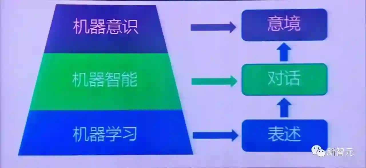 其中,自然语言的理解又包含三个层次:第一层机器学习就可以学到很多东西,第二步就到了机器智能领域,其中涉及的对话以及提问就比较困难了,第三层到了机器意识,意境。实际上这三个层次的东西是可以转换的。