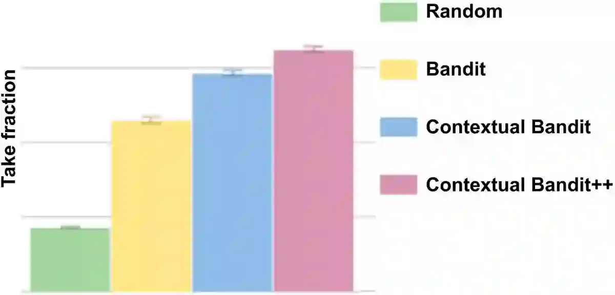 图2:基于图像探索数据记录中重播率,不同算法选择的图像平均分数(越高越好)。随机(绿色)表示随机选择图像,简单的 bandit 算法(黄色)选择具有最高分数的图像。情境 bandit 算法(蓝色和粉红色)根据情境为不同的成员选择不同的图像。