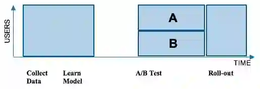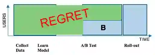 Netflix的推荐引擎有很大一部分是由机器学习算法驱动的。传统上,我们会收集一批关于我们的用户如何使用这项服务的数据。然后我们在这批数据上运行一种新的机器学习算法。接下来,我们将通过一个A/B测试来测试这一新的算法,以对抗当前的系统。A/B测试可以帮助我们在随机分组的成员中进行尝试,了解新算法是否优于当前的系统。A组的成员使用当前的系统,而B组的成员则得到新的算法。如果发现B组的成员与Netflix有更高的互动,那么我们就会向全体成员推出新的算法。不幸的是,这批处理方法会带来遗憾(regret):许多成员长时间没有从更好的体验中受益。如下图所示。