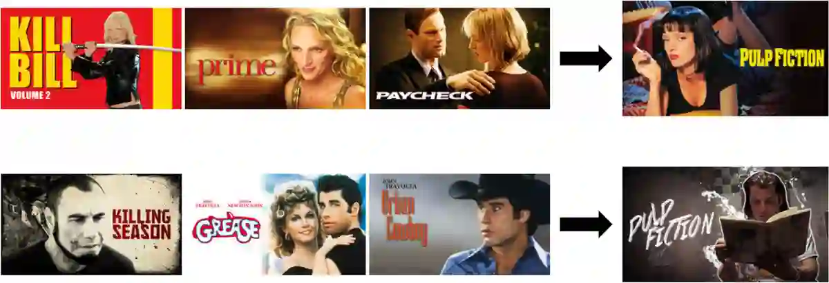 在另一个场景中,让我们想象一下,对演员们的不同喜好会如何影响电影《低俗小说》封面图的个性化。一位看过Uma Thurman许多电影的用户可能会对包含Uma的《低俗小说》的封面图作出积极回应。与此同时,如果封面图具有John Travolta的特色的话,其粉丝可能对看《低俗小说》更感兴趣。