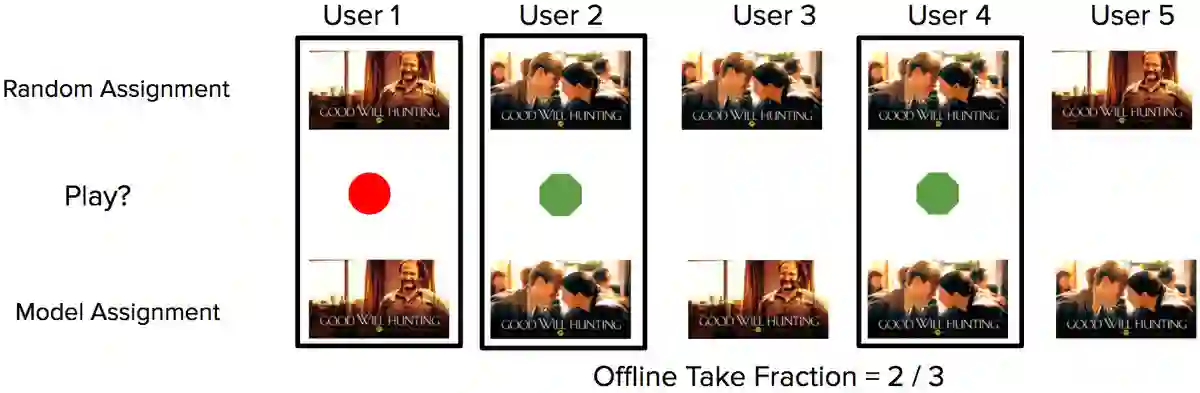 图1:根据记录的数据计算重放指标的简单示例。对于每个成员,分配一个随机的图像(第一行)。系统记录了用户的印象,以及这个页面是否播放了影视作品(绿色圆圈),或者没有播放(红圈)。通过匹配随机分配和模型分配重合的部分(黑色方块),计算该子集的分数来计算新模型的重播指数。