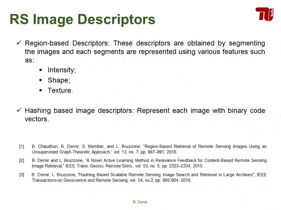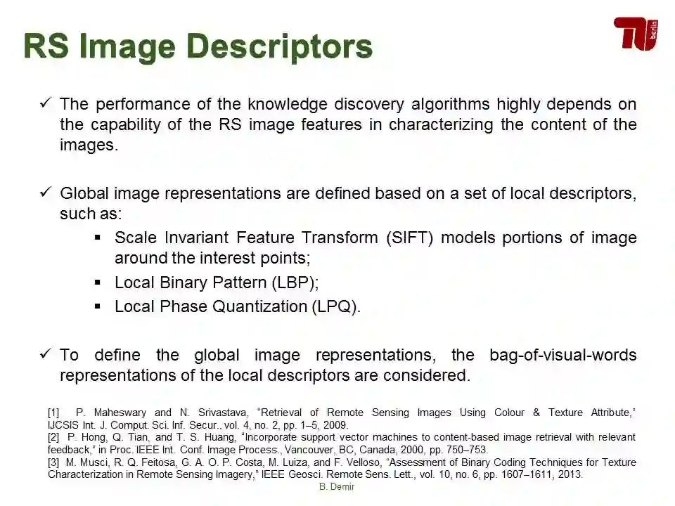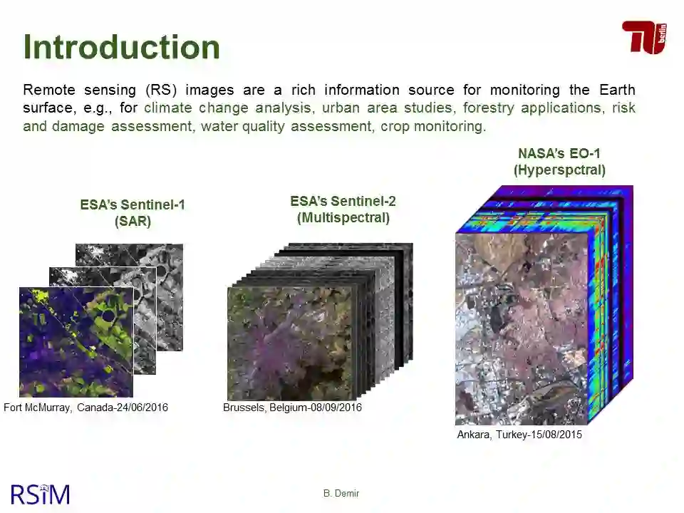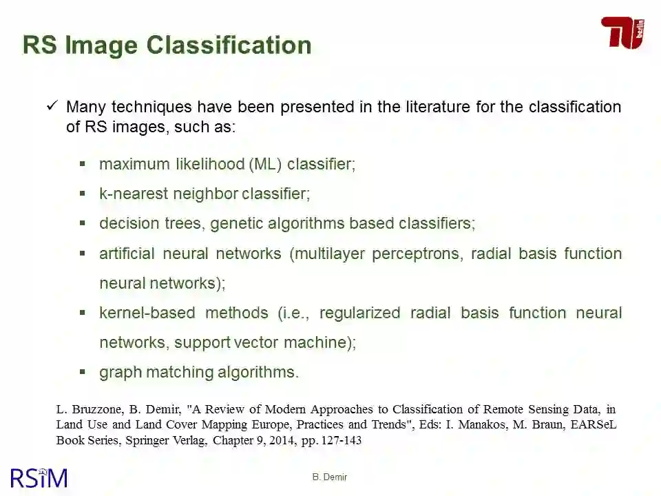 第3部分:卫星图像的知识发现。在本教程的这一部分中,我们将介绍遥感文献,该文献研究模式识别和机器学习技术,以便从卫星图像中提取知识(例如,土地覆盖类)。PPT将展示这一部分