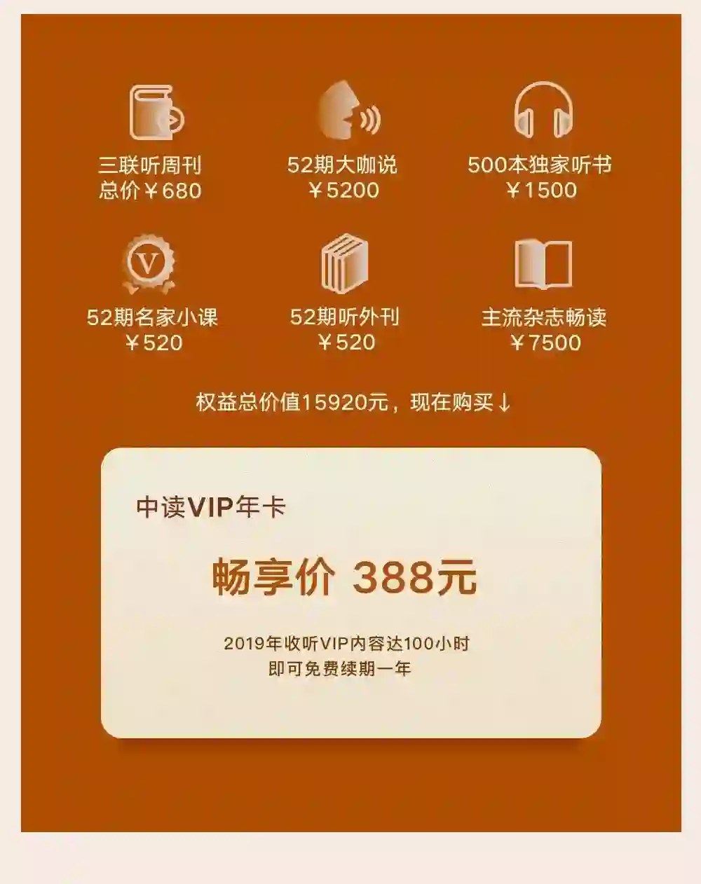 如果你想免费收听以上专题,小编良心推荐中读VIP年卡。除听书外,购买VIP年卡,还可免费领取收听500+独家听书、200+大咖说、150+听外刊、365+听周刊等精彩内容。还可享受特权福利。