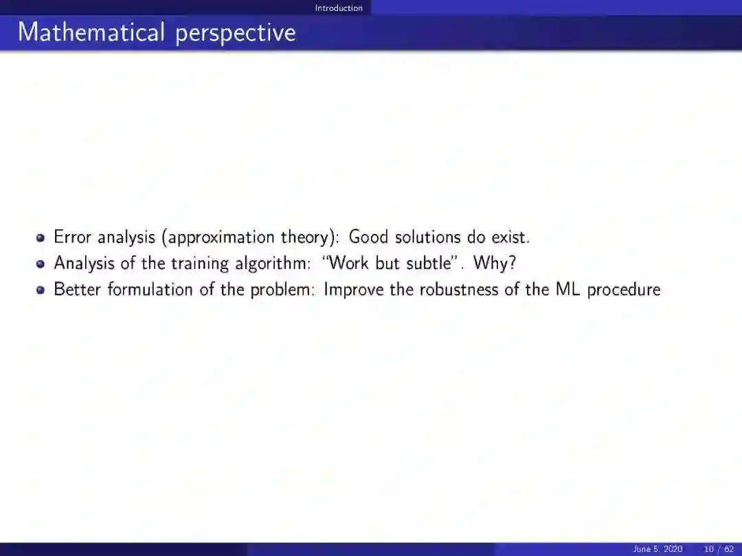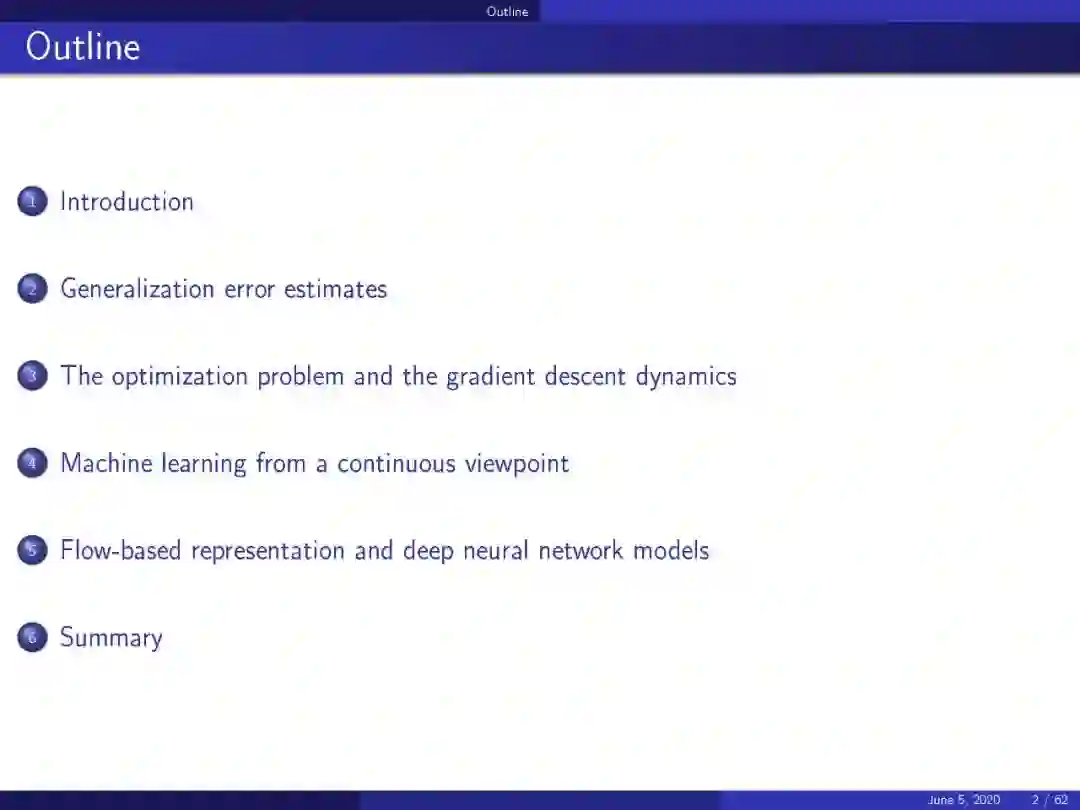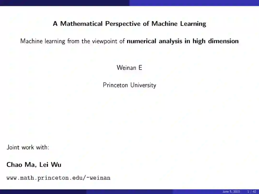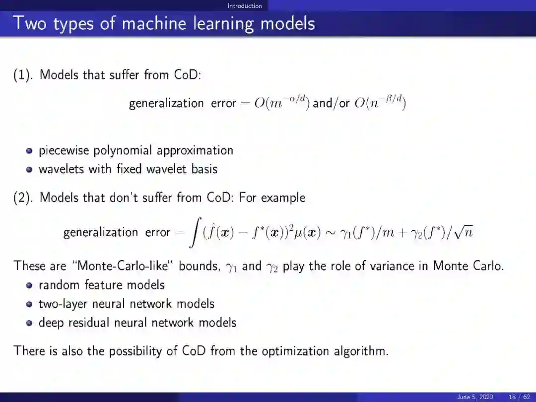 现代机器学习(ML)的核心是高维函数的近似。传统的方法,如用分段多项式、小波或其他固定基函数的线性组合进行逼近,都面临着维数(CoD)的问题。我们将提供ML的数学观点,集中在CoD的问题。我们将讨论三个主要问题: 现代ML模型的近似理论和误差分析,梯度下降算法的动力学和定性行为,以及从连续观点的ML。我们将看到,在连续的水平上,ML可以被表示为一系列合理的漂亮的变分和类似于方程的问题。现代的ML模型/算法,如随机特征模型和两层残差神经网络模型,都可以看作是这类连续问题的特殊离散化。我们还将提供一个适合分析高维ML模型和算法的框架,并提供无CoD的结果。最后,我们将讨论现代ML成功的基本原因,以及仍有待理解的微妙和神秘之处。