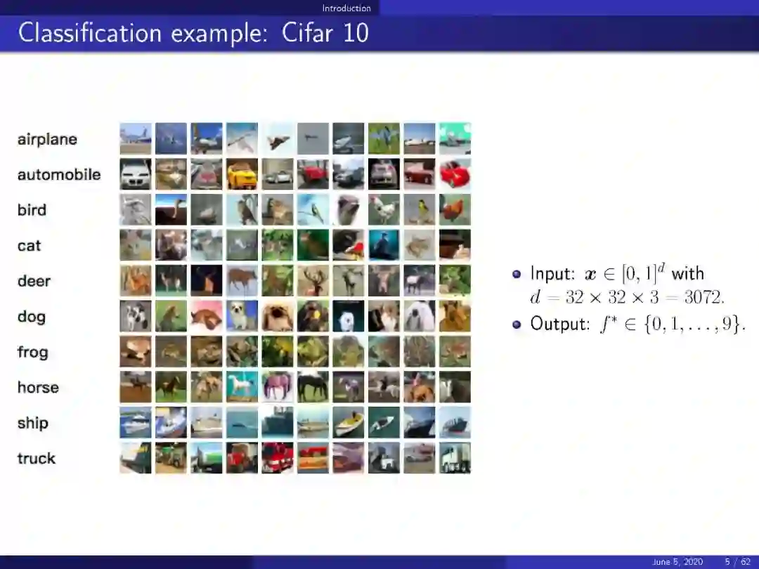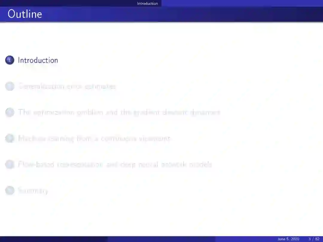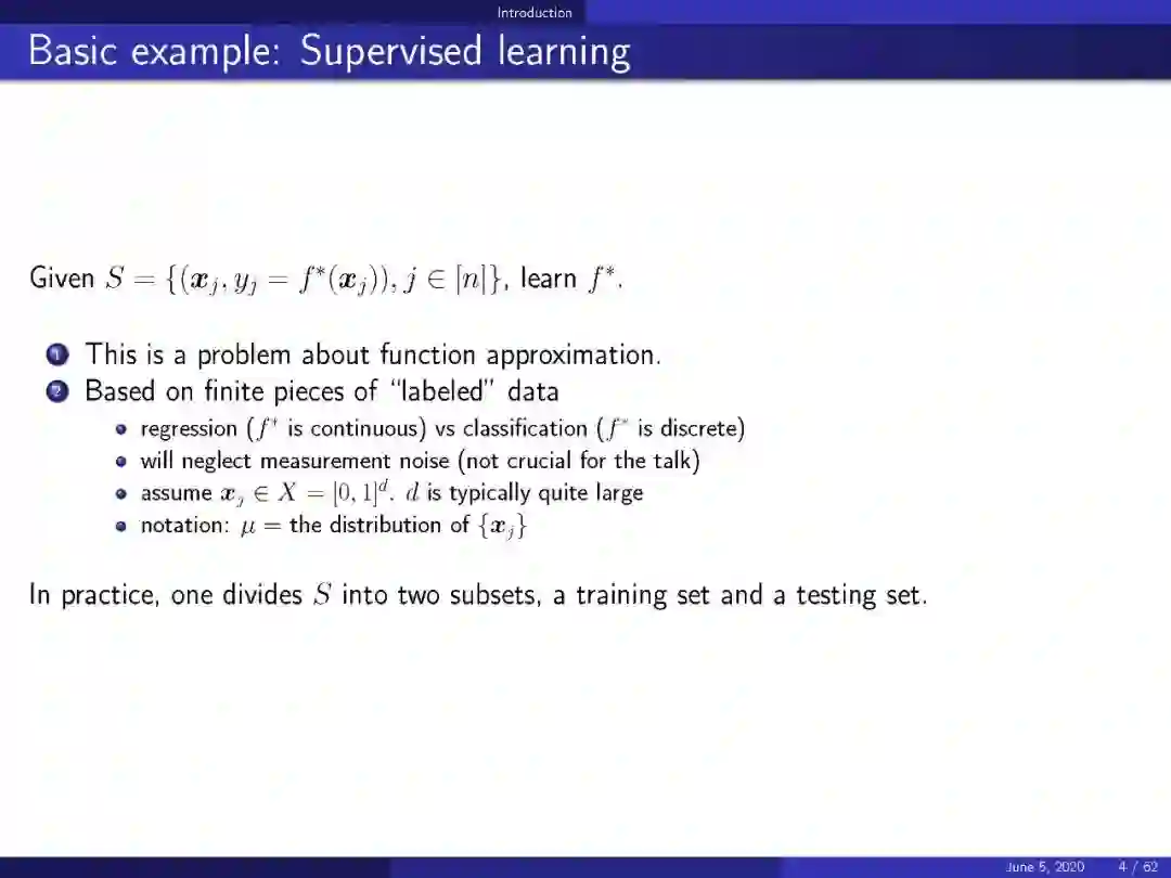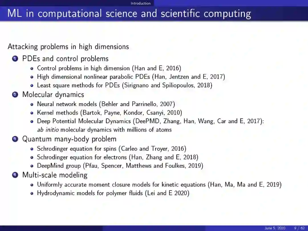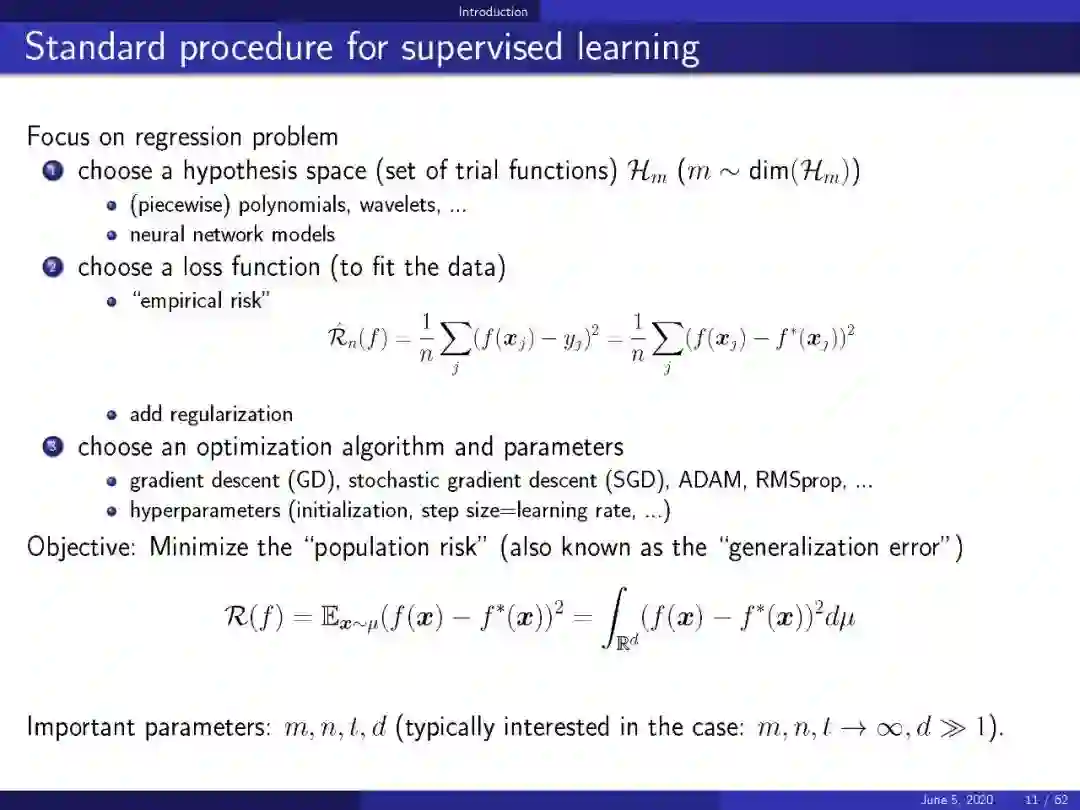现代机器学习(ML)的核心是高维函数的近似。传统的方法,如用分段多项式、小波或其他固定基函数的线性组合进行逼近,都面临着维数(CoD)的问题。我们将提供ML的数学观点,集中在CoD的问题。我们将讨论三个主要问题: 现代ML模型的近似理论和误差分析,梯度下降算法的动力学和定性行为,以及从连续观点的ML。我们将看到,在连续的水平上,ML可以被表示为一系列合理的漂亮的变分和类似于方程的问题。现代的ML模型/算法,如随机特征模型和两层残差神经网络模型,都可以看作是这类连续问题的特殊离散化。我们还将提供一个适合分析高维ML模型和算法的框架,并提供无CoD的结果。最后,我们将讨论现代ML成功的基本原因,以及仍有待理解的微妙和神秘之处。