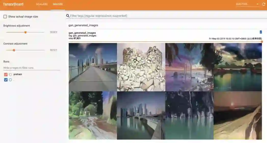 除了指标和损失函数之外,最好还要关注GAN在训练期间生成的图像。使用我们的脚本来监控TensorBoard上生成的图像是明智的做法: