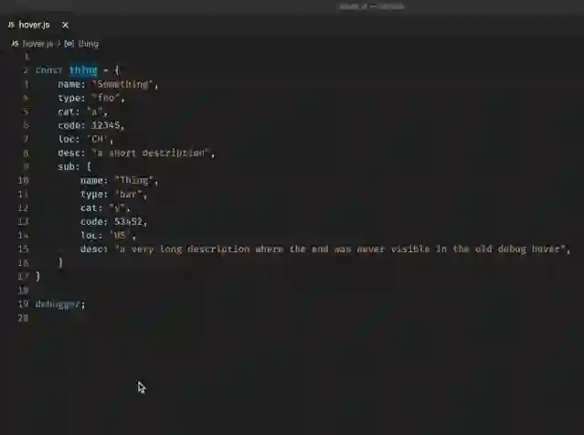 为了最大程度减少滚动需求,悬停调试窗口的宽度和高度现在会自动适应内容的大小。这不仅可以帮助获得完整的字符串,还可以深入到对象结构中。