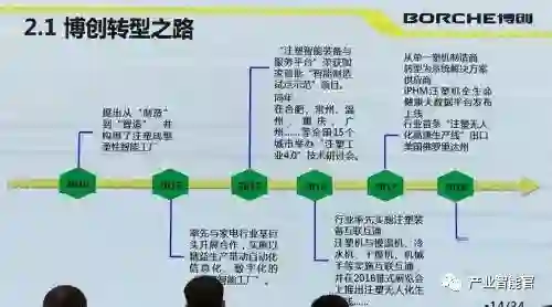 2010年起,博创智能开始探索智能制造。2013年博创开始跟美的、长虹进行战略合作,2015年组建团队班子,到2018年开始进入了一个新的智能制造的方式方法。2015年博创智能成为了中国首批46家智能制造示范企业,提出“注塑工业4.0”,2017年参与了国家注塑机互联互通综合标准的制定。