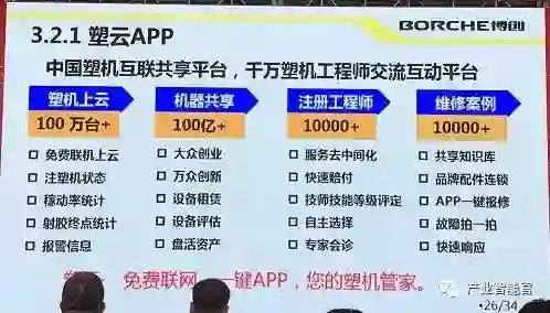 在设备大数据平台的基础上,博创构建了注塑行业的工业互联网平台——塑云平台。通过塑云平台,可以将有订单的企业和有设备的企业联系起来,共享设备资源,并在此基础上实现更多的增值服务,如工厂产品质量把控,机器维修费用、保养费用、维修时间的预测等。这些服务整合到塑云APP,并通过塑云APP连接行业更多人士,整合行业信息,实现更高效资源配置。