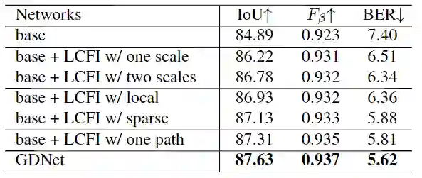 表2.“base”表示网络已删除所有LCFI模块。“one scale”和“two scale”表示LCFI模块中有一个LCFI模块和两个LCFI模块。“local”表示将LCFI中的空间可分离卷积替换为局部卷积,并保持参数大致相同。“sparse”采用空洞卷积来实现与空间可分离卷积相似的感受野。“一个路径”表示在每个LCFI块中只有一个空间可分离的卷积路径。LCFI模块包含四个LCFI模块,每个模块包含两个并行路径。