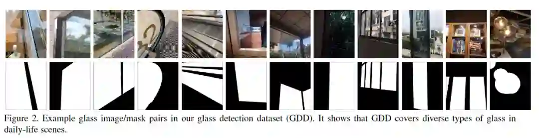 本文从两个方面解决了玻璃检测问题。首先,构建了一个大规模的玻璃检测数据集(GDD),该数据集包含3,916张带有玻璃和相应玻璃掩模的高质量图像,涵盖了各种日常生活场景。其次,提出了一个玻璃检测网络(GDNet),其中嵌入了多个大范围上下文特征集成(LCFI)模块,以从一个大的感受野中采集大量的低层和高层上下文,以进行准确检测不同场景中的不同大小的玻璃杯。