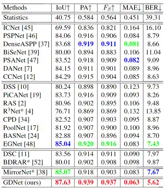 评价指标:采用了五个指标来定量评估玻璃检测性能。前两个指标是IoU和像素精度(PA),还从显着物体检测中采用F度量和平均绝对误差(MAE)度量。最后一个指标是平衡错误率(BER),它是阴影检测领域中的标准指标,与前三个指标不同,对于MAE和BER,其值越低,检测结果越好。