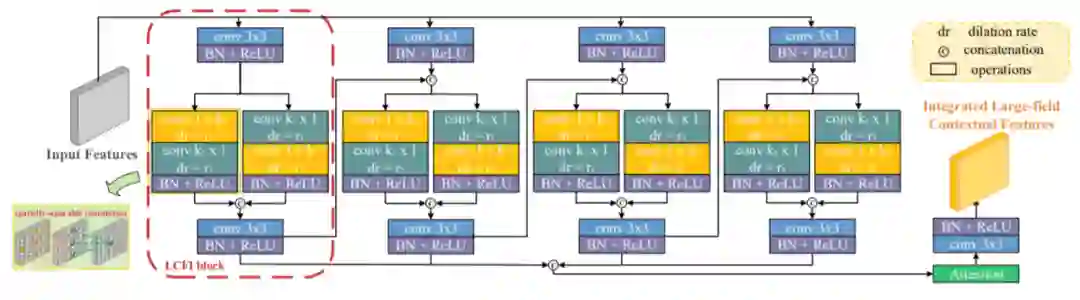 为了解决这个问题,基于LCFI块提出了一个LCFI模块来从不同规模的大领域中获取上下文特征。具体来说,将输入特征输入到四个并行LCFI块中,并使用注意力模块融合其输出。为了进一步探索更多的上下文功能,在相邻LCFI块之间添加了信息流,即,将当前LCFI块的输出馈送到下一个LCFI块。实际上,对于四个LCFI块中的空间上可分离的卷积,卷积核核大小分别设置为3、5、7、9,空洞率分别设置为1、2、3、4。