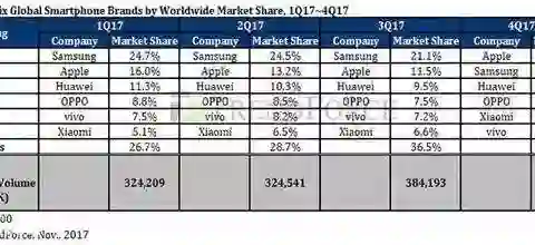 2、今年Q3全球手机销量榜:iPhone7位居第一