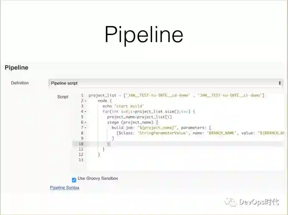 Pipeline 目前主要用在是批量构建,一个产品有可能拆成50个微服务,在开发阶段经常需要批量执行所有服务的构建部署。