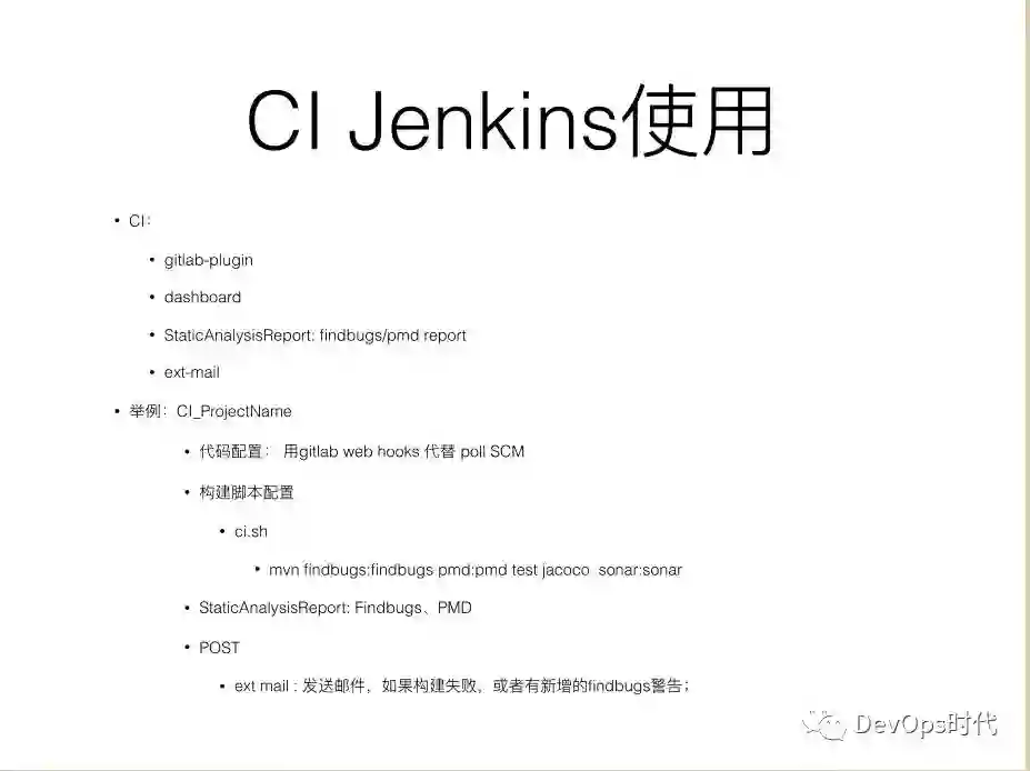 我们选了 GitLab-plugin用来和gitlab集成;Dashboard 能生成一些图表,静态分析的报告;邮件的选了 ext mail ,做自定义的邮件的推送,(构建失败,或者有新增的 findbugs 警告的时发邮件给相关人) 。