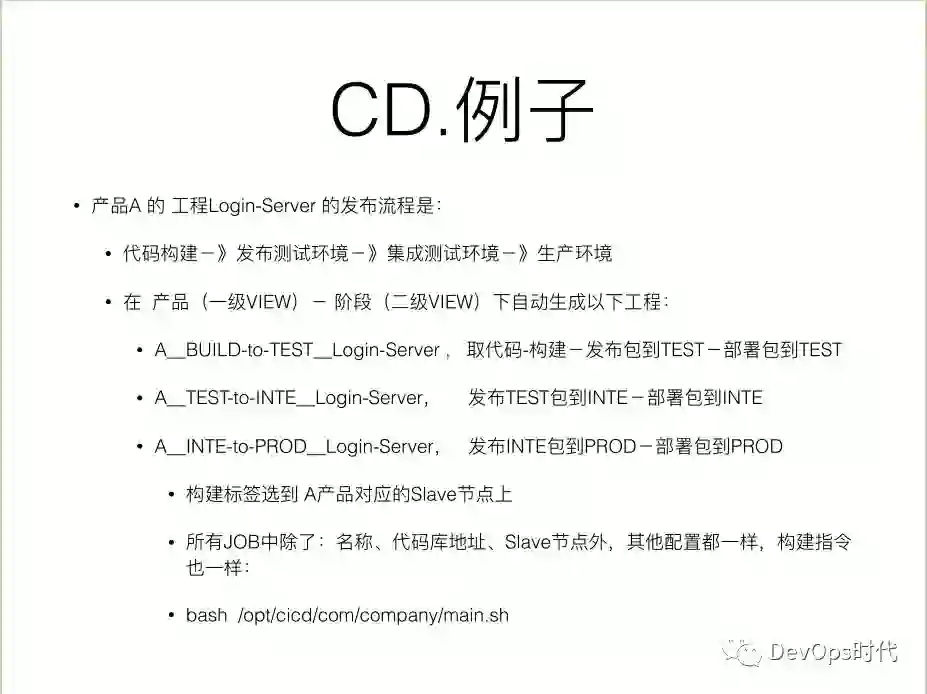 上图是一个CD例子,产品A的工程 Login-Server 的发布流程,代码构建-》发布测试环境-》集成测试环境-》生产环境。