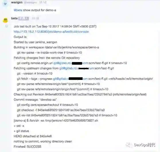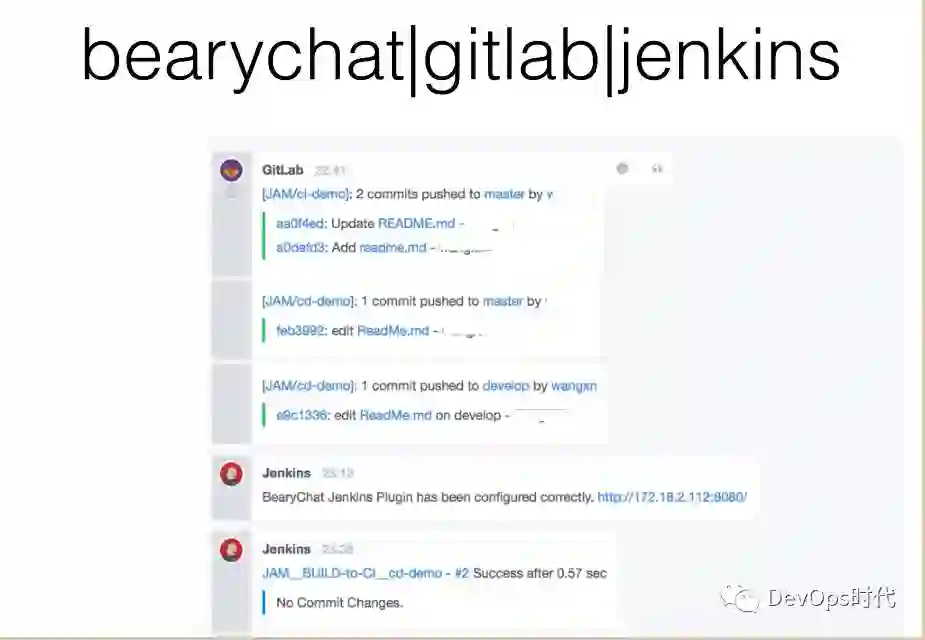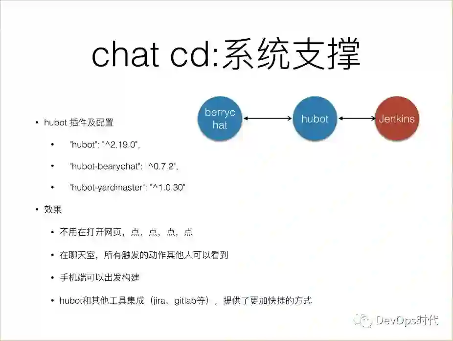 效果是:不用打开网页点点点;在聊天室,所有触发的动作其他人可以看到; 还有一个比较方便的点,手机端装一个 bearychat 客户端,比如你正在坐班车或者正在下班路上,手机可以触发一些事,也可以查某个机器的状态。 hubot 和其他工具也可以做集成,如 Jira 、 GitLab ,提供更加快捷的方式。
