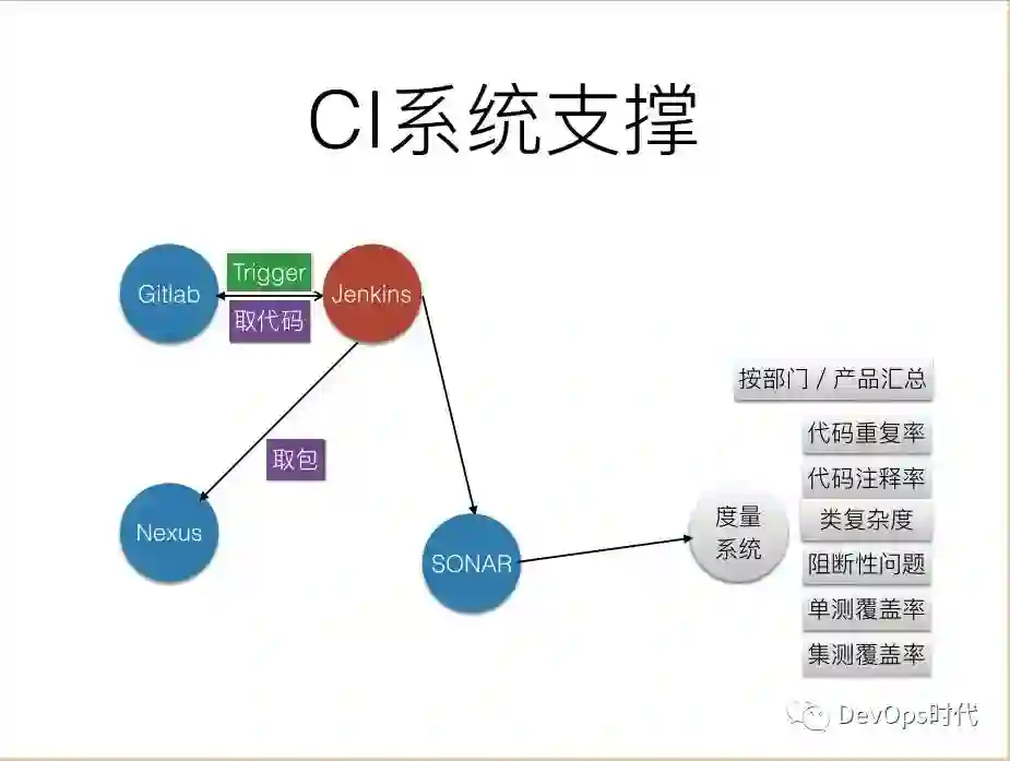 通过Gitlab pushed webhook 触发Jenkins 执行构建:取代码、编译、单测、静态分析、集成测试(部分项目)、sonar-scan 。通过度量系统对数据进行进一步的加工发布给相关人,比如按部门/产品汇总,可以给每个产品或者每个部门提供相应的代码重复率、注释率、类复杂度、阻断性问题单测覆盖率、集测覆盖率的数据。