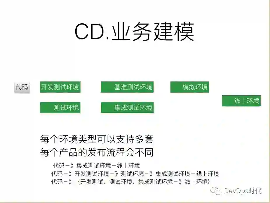 从代码到开发测试环境和测试环境、基准测试环境、集成测试环境、模拟环境和线上环境,每个环境可以支持多套,环境部署成功后会自动调用集成测试。